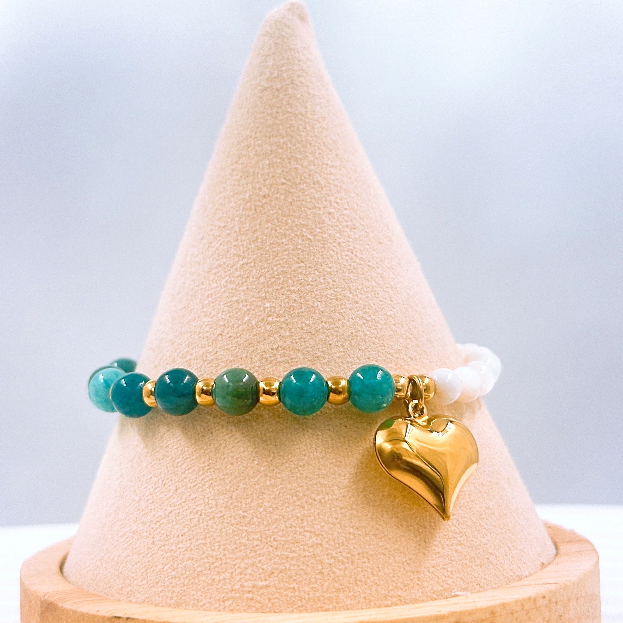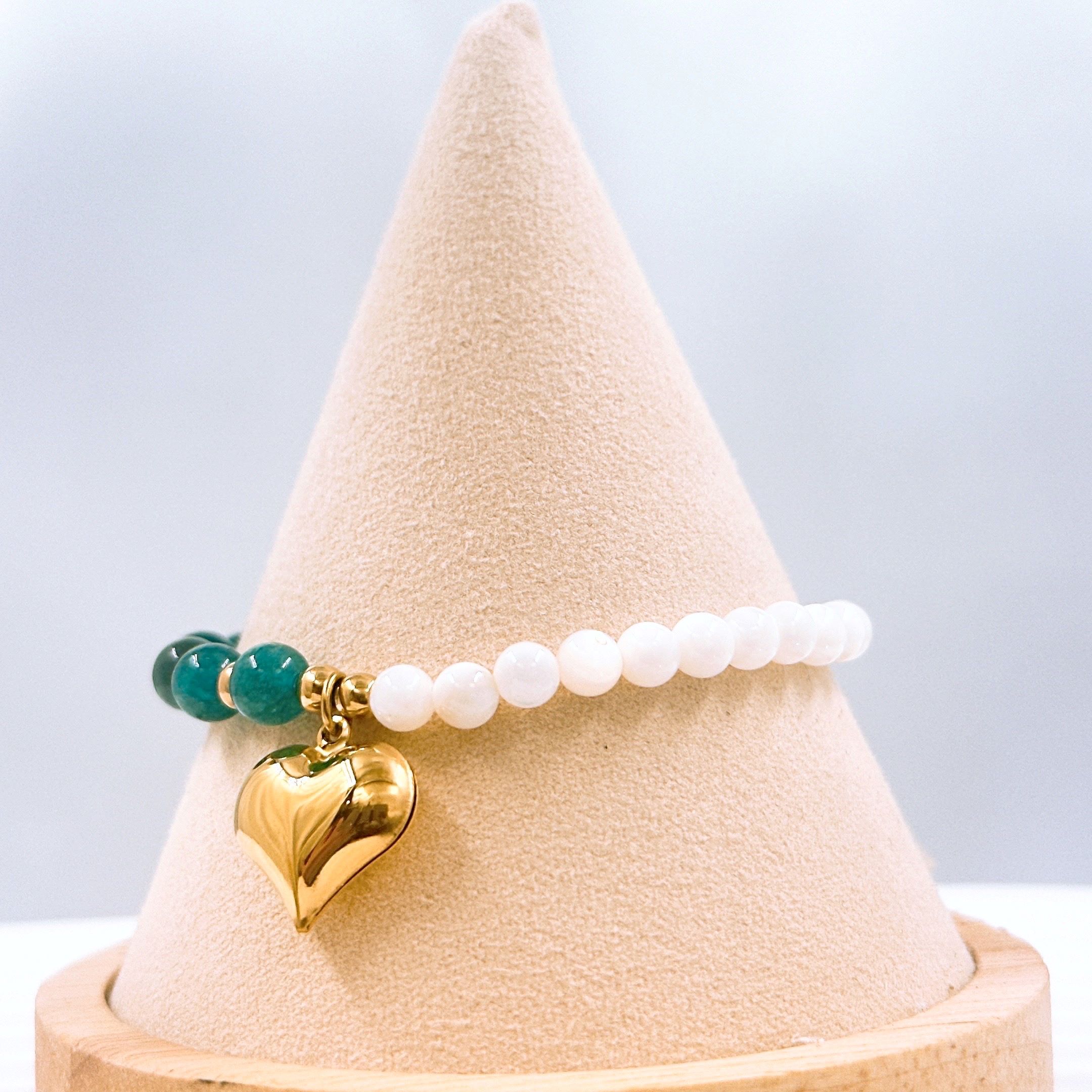 Pulsera con perlas blancas y verdes, y un corazón dorado