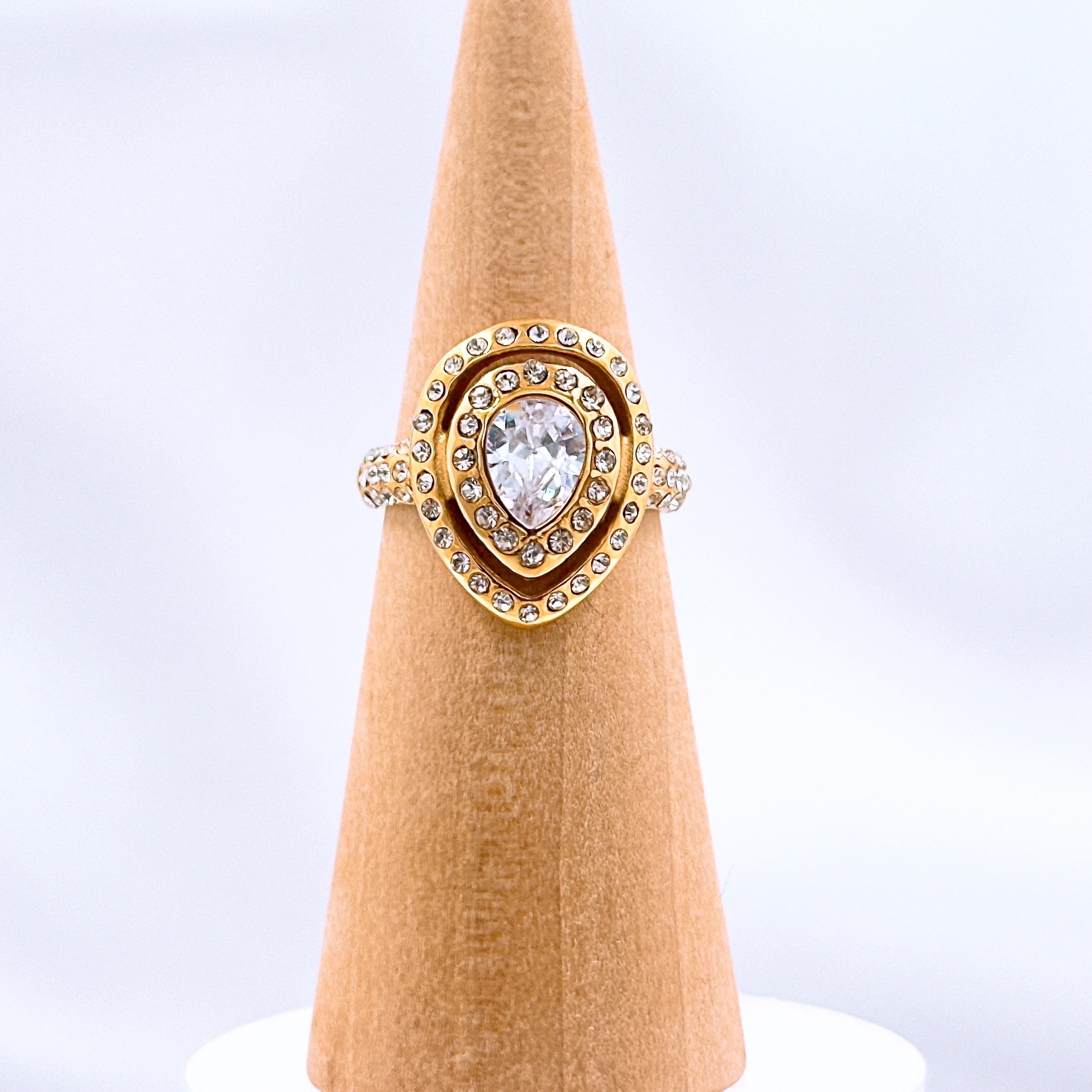 Anillo dorado con gota de brillos