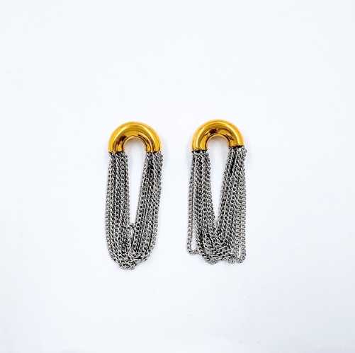 Aretes con medio circulo dorado y cadenas plateadas colgando